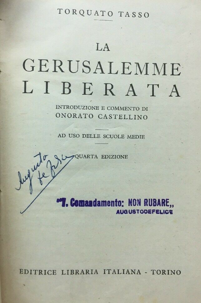TORQUATO TASSO LA GERUSALEMME LIBERATA COMMENTO DI O. CASTELLINO EDITRICE LIBRARIA ITALIANA 1942 METODI DI PAGAMENTO PayPal Bonifico (solo da Italia per un importo minimo di 11€) TEMPI DI SPEDIZIONE La spedizione parte entro 24 ore dall'accredito del pagamento TEMPI DI CONSEGNA I tempi di consegna dipendono dalle Poste Italiane e i venditori non ne hanno alcun controllo infatti la valutazione dettagliata richiesta da ebay si riferisce ai tempi di SPEDIZIONE e non di CONSEGNA FEEDBACK E VALUTAZIONI Anche la valutazione dettagliata (quella da 1 a 5 stelline) è molto importante. Secondo gli standard di ebay ricevere una valutazione da 1 a 4 stelline significa ricevere una valutazione Negativa. Vi chiediamo pertanto se siete stati soddisfatti del nostro servizio di rilasciare una valutazione dettagliata di 5 stelline in tutti e quattro i campi richiesti FOREIGN BUYERS ASK FOR SHIPPING COSTS PER PIU' OGGETTI ACQUISTATI SPEDIZIONE UNICA QUINDI LE SPESE NON AUMENTANO !!! Prima di effettuare il pagamento attendere la mail con l'importo complessivo - RACCOMANDATA 5€ (Consigliata !!!) Questa spedizione è sicura al 100% si riceve in 3gg/5gg - PACCO ORDINARIO=POSTA ORDINARIA "piego libri" 3 00€ (Senza ricevuta) Se scegliete questa spedizione impiega 10gg/15gg senza ricevuta non ci riteniamo responsabili per eventuali smarrimenti ACQUISTA x 100 00€ LE SPESE DI SPEDIZIONE SARANNO GRATIS !!! - Collezione: Libri e Riviste - Tags : "Narrativa"