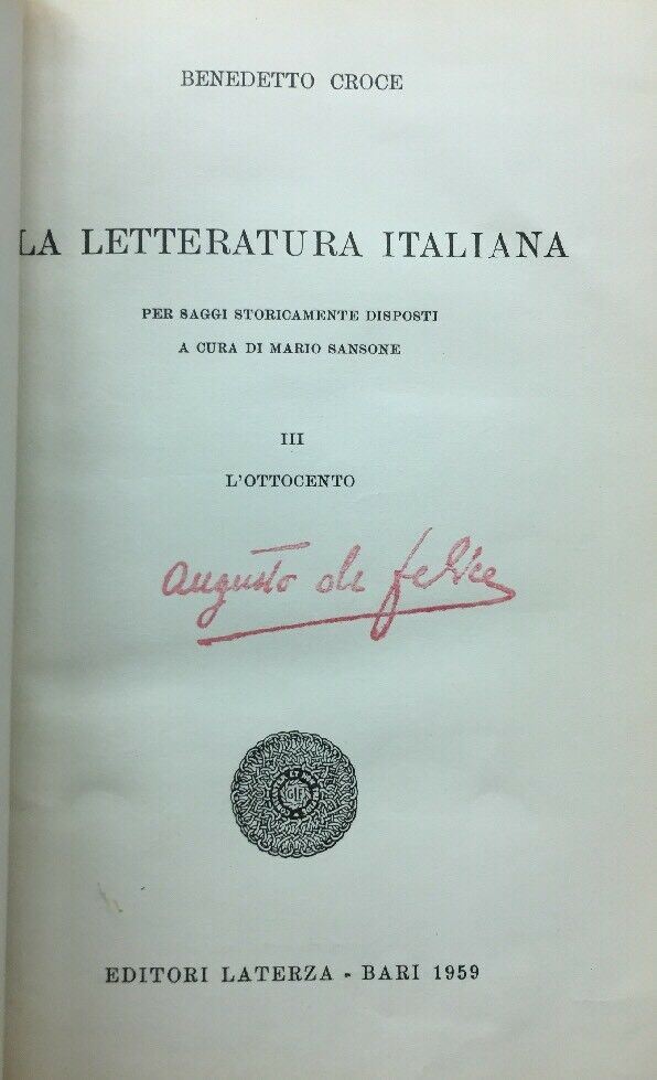 BENEDETTO CROCE LA LETTERATURA ITALIANA VOL. III L’OTTOCENTO LATERZA EDITORE 1959 METODI DI PAGAMENTO PayPal Bonifico TEMPI DI SPEDIZIONE La spedizione parte entro 24 ore dall'accredito del pagamento TEMPI DI CONSEGNA I tempi di consegna dipendono dalle Poste Italiane e i venditori non ne hanno alcun controllo infatti la valutazione dettagliata richiesta da ebay si riferisce ai tempi di SPEDIZIONE e non di CONSEGNA FEEDBACK E VALUTAZIONI Anche la valutazione dettagliata (quella da 1 a 5 stelline) è molto importante. Secondo gli standard di ebay ricevere una valutazione da 1 a 4 stelline significa ricevere una valutazione Negativa. Vi chiediamo pertanto se siete stati soddisfatti del nostro servizio di rilasciare una valutazione dettagliata di 5 stelline in tutti e quattro i campi richiesti FOREIGN BUYERS ASK FOR SHIPPING COSTS PER PIU' OGGETTI ACQUISTATI SPEDIZIONE UNICA QUINDI LE SPESE NON AUMENTANO !!! Prima di effettuare il pagamento attendere la mail con l'importo complessivo - RACCOMANDATA 5€ (Consigliata !!!) Questa spedizione è sicura al 100% si riceve in 3gg/5gg - PACCO ORDINARIO=POSTA ORDINARIA "piego libri" 2 00€ (Senza ricevuta) Se scegliete questa spedizione impiega 10gg/15gg senza ricevuta non ci riteniamo responsabili per eventuali smarrimenti ACQUISTA x 100 00€ LE SPESE DI SPEDIZIONE SARANNO GRATIS !!! - Collezione: Libri e Riviste - Tags : "Saggistica"