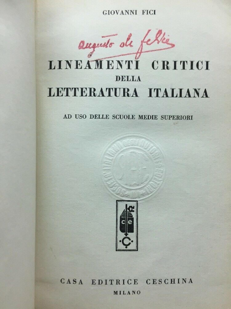 GIOVANNI FICI LINEAMENTI CRITICI DELLA LETTERATURA ITALIANA CESCHINA 1963 METODI DI PAGAMENTO PayPal Bonifico TEMPI DI SPEDIZIONE La spedizione parte entro 24 ore dall'accredito del pagamento TEMPI DI CONSEGNA I tempi di consegna dipendono dalle Poste Italiane e i venditori non ne hanno alcun controllo infatti la valutazione dettagliata richiesta da ebay si riferisce ai tempi di SPEDIZIONE e non di CONSEGNA FEEDBACK E VALUTAZIONI Anche la valutazione dettagliata (quella da 1 a 5 stelline) è molto importante. Secondo gli standard di ebay ricevere una valutazione da 1 a 4 stelline significa ricevere una valutazione Negativa. Vi chiediamo pertanto se siete stati soddisfatti del nostro servizio di rilasciare una valutazione dettagliata di 5 stelline in tutti e quattro i campi richiesti FOREIGN BUYERS ASK FOR SHIPPING COSTS PER PIU' OGGETTI ACQUISTATI SPEDIZIONE UNICA QUINDI LE SPESE NON AUMENTANO !!! Prima di effettuare il pagamento attendere la mail con l'importo complessivo - RACCOMANDATA 5€ (Consigliata !!!) Questa spedizione è sicura al 100% si riceve in 3gg/5gg - PACCO ORDINARIO=POSTA ORDINARIA "piego libri" 2 00€ (Senza ricevuta) Se scegliete questa spedizione impiega 10gg/15gg senza ricevuta non ci riteniamo responsabili per eventuali smarrimenti ACQUISTA x 100 00€ LE SPESE DI SPEDIZIONE SARANNO GRATIS !!! - Collezione: Libri e Riviste - Tags : "Saggistica, Didattici Corsi Dizionari"