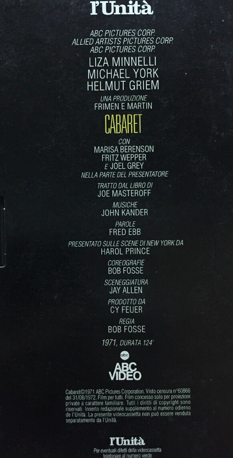 VHS CABARET L’UNITA’ METODI DI PAGAMENTO PayPal Bonifico TEMPI DI SPEDIZIONE La spedizione parte entro2 ore dall'accredito del pagamento TEMPI DI CONSEGNA I tempi di consegna dipendono dalle Poste Italiane e i venditori non ne hanno alcun controllo infatti la valutazione dettagliata richiesta da ebay si riferisce ai tempi di SPEDIZIONE e non di CONSEGNA FEEDBACK E VALUTAZIONI Anche la valutazione dettagliata (quella da 1 a 5 stelline) è molto importante. Secondo gli standard di ebay ricevere una valutazione da 1 a 4 stelline significa ricevere una valutazione Negativa. Vi chiediamo pertanto se siete stati soddisfatti del nostro servizio di rilasciare una valutazione dettagliata di 5 stelline in tutti e quattro i campi richiesti FOREIGN BUYERS ASK FOR SHIPPING COSTS PER PIU' OGGETTI ACQUISTATI SPEDIZIONE UNICA QUINDI LE SPESE NON AUMENTANO !!! Prima di effettuare il pagamento attendere la mail con l'importo complessivo - RACCOMANDATA 5€ (Consigliata !!!) Questa spedizione è sicura al 100% si riceve in 3gg/5gg - PACCO ORDINARIO - POSTA ORDINARIA "piego di libri" 2 00€ (Senza ricevuta) Se scegliete questa spedizione impiega 10gg/15gg senza ricevuta non ci riteniamo responsabili per eventuali smarrimenti ACQUISTA x 100 00€ LE SPESE DI SPEDIZIONE SARANNO GRATIS !!! - Collezione: Musica - Cinema - Teatro - Tags : "Vhs"