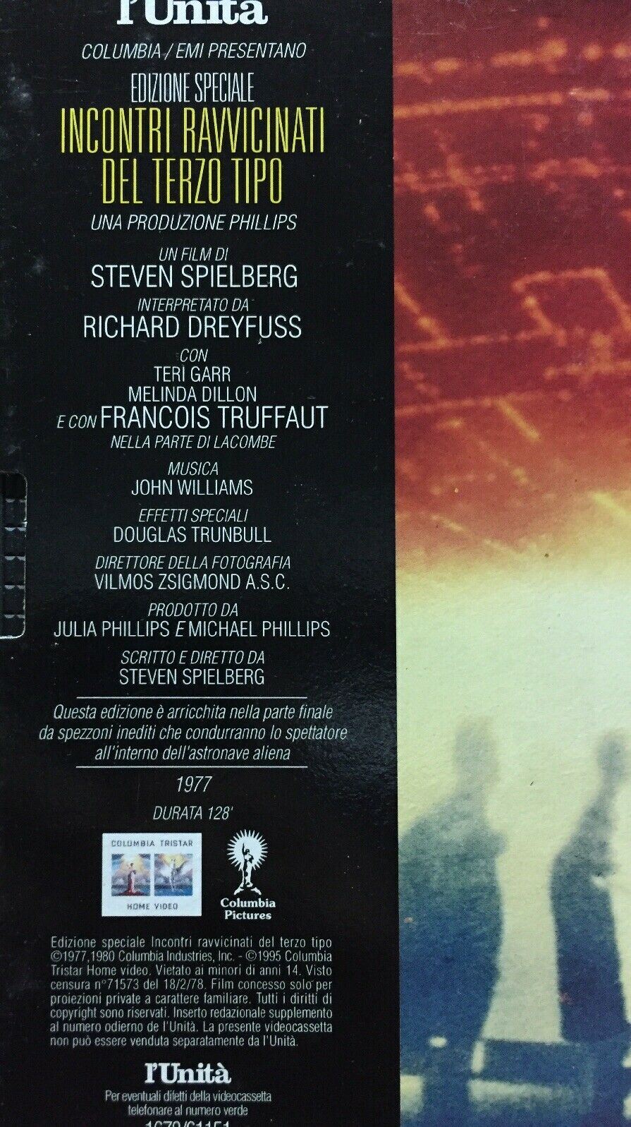 VHS INCONTRI RAVVICINATI DEL TERZO TIPO L’UNITA’ METODI DI PAGAMENTO PayPal Bonifico TEMPI DI SPEDIZIONE La spedizione parte entro2 ore dall'accredito del pagamento TEMPI DI CONSEGNA I tempi di consegna dipendono dalle Poste Italiane e i venditori non ne hanno alcun controllo infatti la valutazione dettagliata richiesta da ebay si riferisce ai tempi di SPEDIZIONE e non di CONSEGNA FEEDBACK E VALUTAZIONI Anche la valutazione dettagliata (quella da 1 a 5 stelline) è molto importante. Secondo gli standard di ebay ricevere una valutazione da 1 a 4 stelline significa ricevere una valutazione Negativa. Vi chiediamo pertanto se siete stati soddisfatti del nostro servizio di rilasciare una valutazione dettagliata di 5 stelline in tutti e quattro i campi richiesti FOREIGN BUYERS ASK FOR SHIPPING COSTS PER PIU' OGGETTI ACQUISTATI SPEDIZIONE UNICA QUINDI LE SPESE NON AUMENTANO !!! Prima di effettuare il pagamento attendere la mail con l'importo complessivo - RACCOMANDATA 5€ (Consigliata !!!) Questa spedizione è sicura al 100% si riceve in 3gg/5gg - PACCO ORDINARIO - POSTA ORDINARIA "piego di libri" 2 00€ (Senza ricevuta) Se scegliete questa spedizione impiega 10gg/15gg senza ricevuta non ci riteniamo responsabili per eventuali smarrimenti ACQUISTA x 100 00€ LE SPESE DI SPEDIZIONE SARANNO GRATIS !!! - Collezione: Musica - Cinema - Teatro - Tags : "Vhs"
