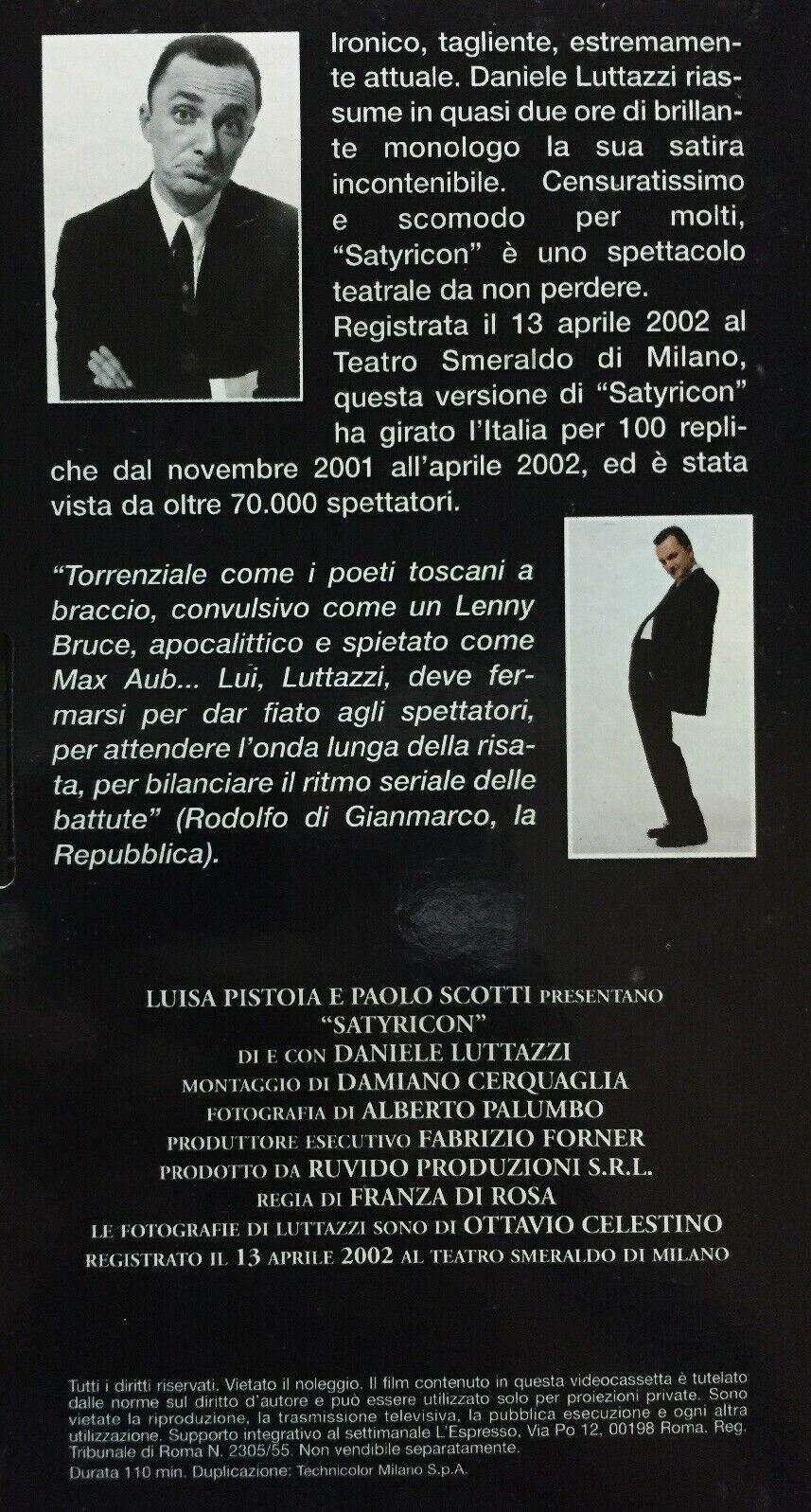 VHS SATYRICON L’ESPRESSO CINEMA METODI DI PAGAMENTO PayPal Bonifico TEMPI DI SPEDIZIONE La spedizione parte entro2 ore dall'accredito del pagamento TEMPI DI CONSEGNA I tempi di consegna dipendono dalle Poste Italiane e i venditori non ne hanno alcun controllo infatti la valutazione dettagliata richiesta da ebay si riferisce ai tempi di SPEDIZIONE e non di CONSEGNA FEEDBACK E VALUTAZIONI Anche la valutazione dettagliata (quella da 1 a 5 stelline) è molto importante. Secondo gli standard di ebay ricevere una valutazione da 1 a 4 stelline significa ricevere una valutazione Negativa. Vi chiediamo pertanto se siete stati soddisfatti del nostro servizio di rilasciare una valutazione dettagliata di 5 stelline in tutti e quattro i campi richiesti FOREIGN BUYERS ASK FOR SHIPPING COSTS PER PIU' OGGETTI ACQUISTATI SPEDIZIONE UNICA QUINDI LE SPESE NON AUMENTANO !!! Prima di effettuare il pagamento attendere la mail con l'importo complessivo - RACCOMANDATA 5€ (Consigliata !!!) Questa spedizione è sicura al 100% si riceve in 3gg/5gg - PACCO ORDINARIO - POSTA ORDINARIA "piego di libri" 2 00€ (Senza ricevuta) Se scegliete questa spedizione impiega 10gg/15gg senza ricevuta non ci riteniamo responsabili per eventuali smarrimenti ACQUISTA x 100 00€ LE SPESE DI SPEDIZIONE SARANNO GRATIS !!! - Collezione: Musica - Cinema - Teatro - Tags : "Vhs"